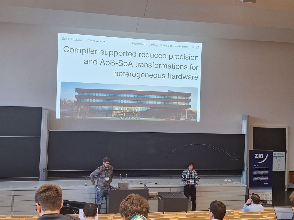 - Pawel Radtke, a PhD student supervised by Weinzierl, presented “Compiler-Supported Reduced Precision and AoS-SoA Transformations for Heterogeneous Hardware.” His work explores how compiler techniques can automatically transform data layouts and precision levels to improve performance on modern heterogeneous computing platforms.